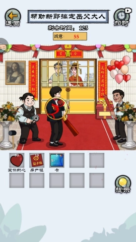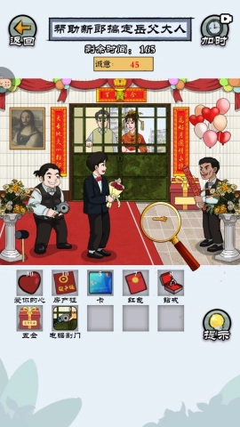 拖动放大镜到新郎身上,查找房产证、银行卡以及那颗“爱你的心”。