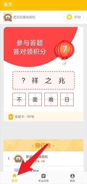 首页呈现当前题目、积分以及排行榜信息,参与答题能够获得奖励积分并提升排名。