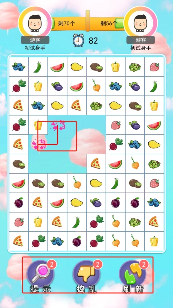 要是消除遇到阻碍,就点击底部的提示来寻找能消除的组合,还可以用捣乱技能干扰对手,或者刷新页面重置布局,通过合理运用这些技能来优化消除策略。
