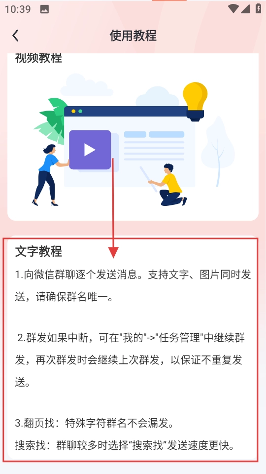 3、返回使用教程,查看文字教程,知晓群发好友数量限制,频率提示及应对方法。