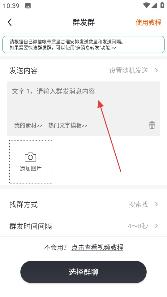 2、在群发群页,输入群发消息内容,可添加图片,设置找群方式和群发间隔。