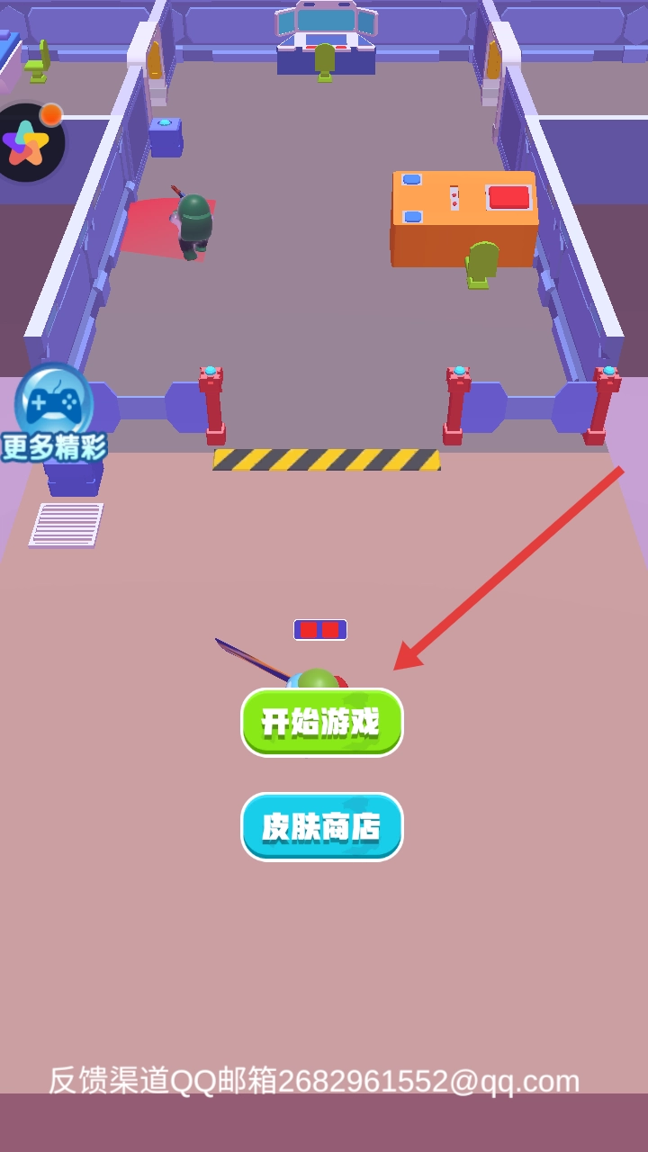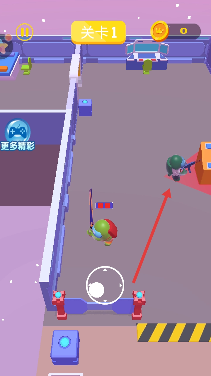 1、点击主界面开始游戏,进入关卡1,操控绿色角色,利用虚拟摇杆移动,沿箭头方向接近持枪敌人。