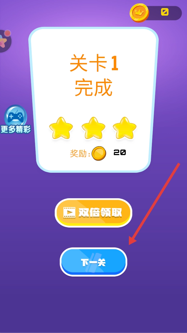 3、关卡1完成后,点击下一关,继续挑战新关卡,积累金币可前往皮肤商店解锁外观。