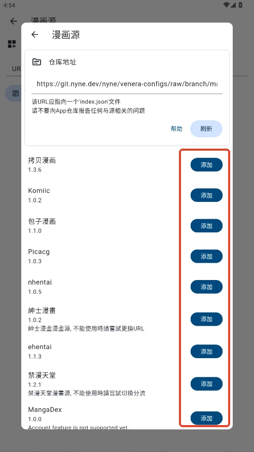 3. 具备多个漫画来源,点击添加操作即可。