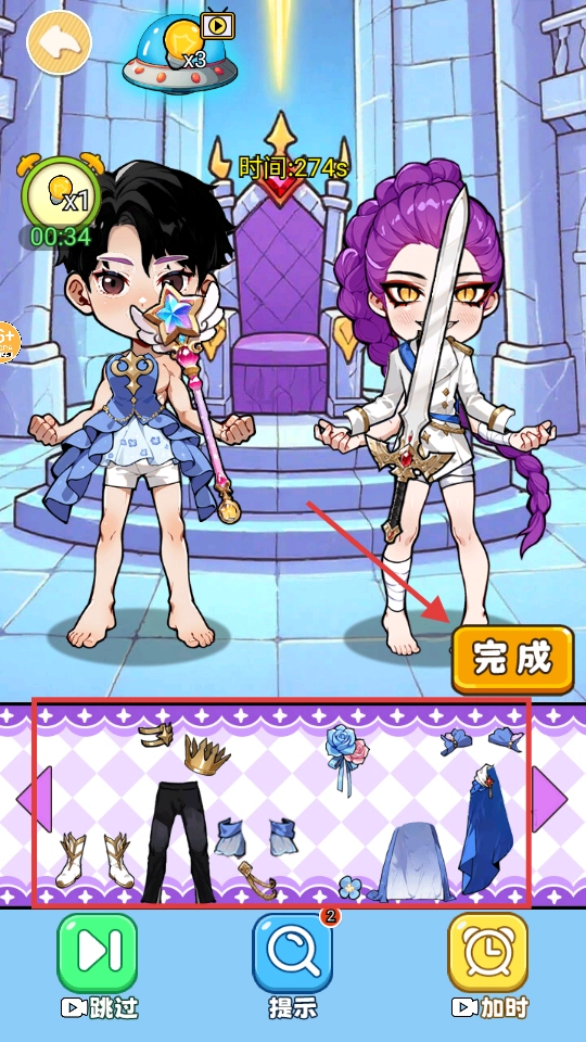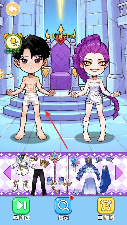 你需要在284秒内,从下方的服饰栏里挑选服装、饰品等物品来给角色进行装扮,过程中可以利用提示功能。