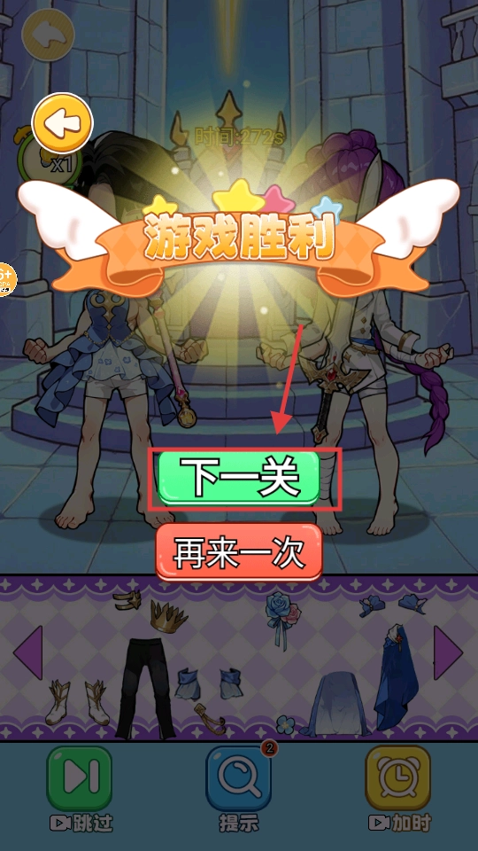 游戏获胜后,点击【下一关】按钮,即可挑战全新的换装关卡,解锁更多服饰和奖励。
