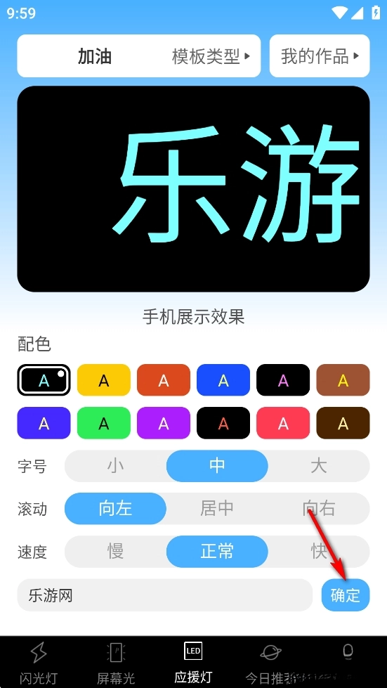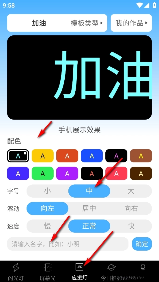 点击【应援灯】,能够选择配色、字体大小、滚动输入等设置
