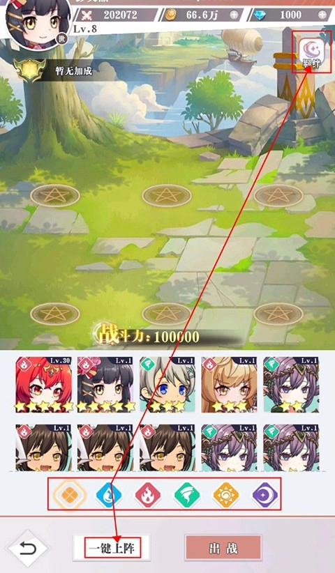 在开启冒险之前,玩家能够调整自己的阵容。可以依据英雄的羁绊来进行调整,点击右上角的羁绊选项就能查看相关信息,也可以点击左下角的“一键上阵”功能按钮。