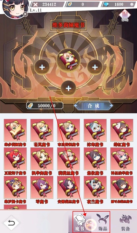 除了装备合成外,玩家还能点击下方的“饰品”与“魔书”选项,来进行装饰品和魔法书的合成升级操作。