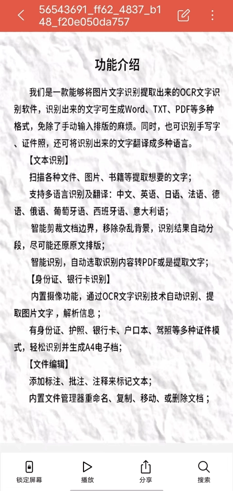 保存完成后,你将进入“我的文件”页面。在此页面中,你可以选择并打开想要查看的文件。进入文件后,点击右上角的三点图标,会弹出打印、投屏、缩略图、设置以及用其他应用打开等功能选项,你可根据实际需求使用这些功能。此外,你还能点击“编辑”按钮对文件进行编辑操作,页面底部还设有锁定屏幕、播放、分享和搜索功能。