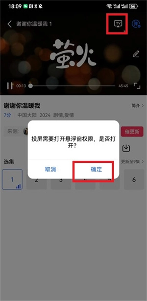 在界面里,我们点击播放视频的区域后,就能看到右上角出现【tv】标识,点击该标识即可发起投屏操作。不过在此之前需要先完成授权步骤,请点击【确定】按钮来为软件授予相应权限。