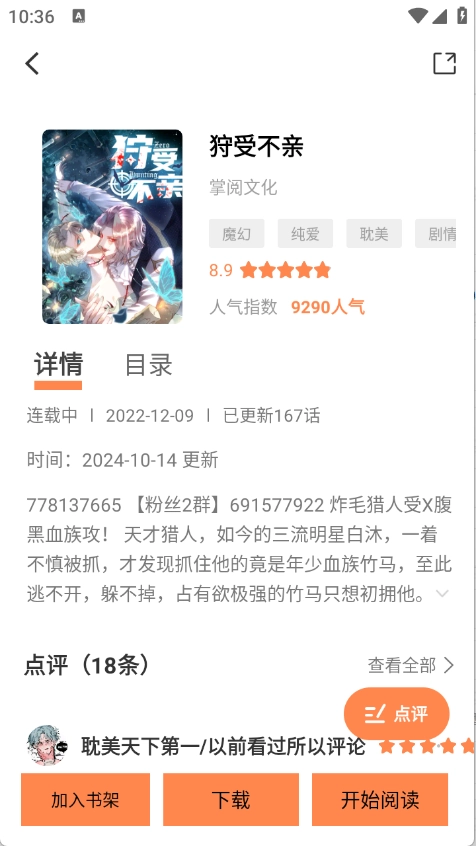 打开你想看的漫画进入详情页面后,就能把这部漫画添加到书架里,还可以直接开始阅读。