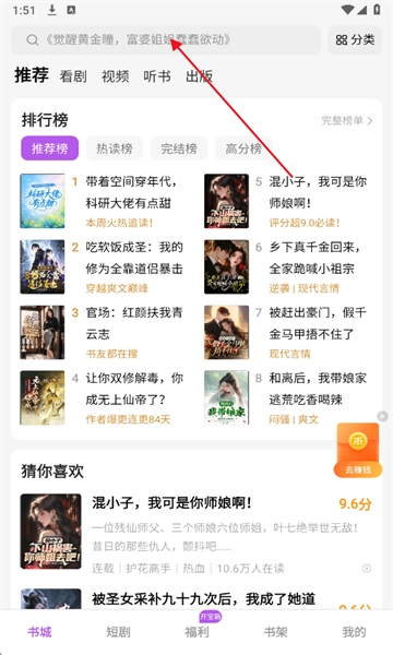 你可以在书城挑选自己喜欢的小说,也能直接点击页面上方的搜索框来查找。