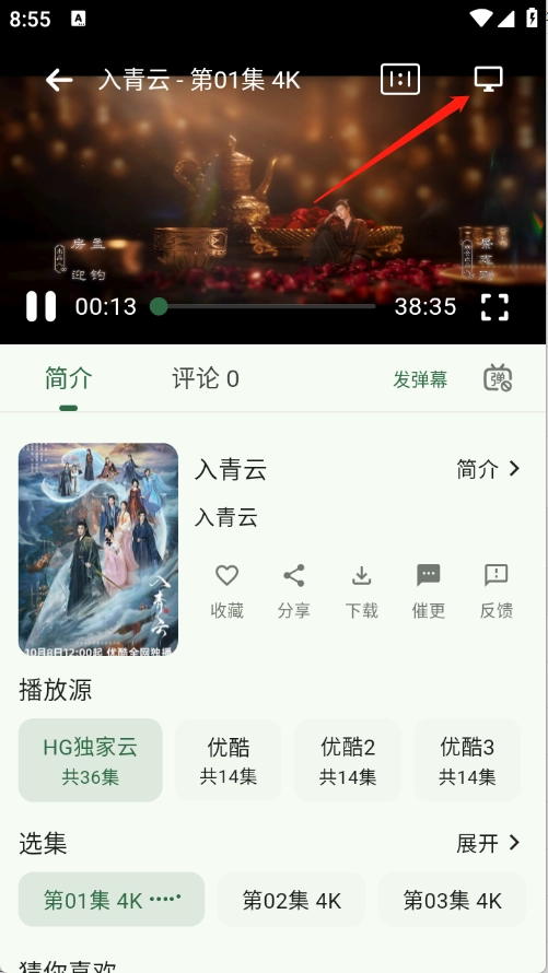用户打开想看的影视作品进入详情页面后,点击右上角的投屏按钮。