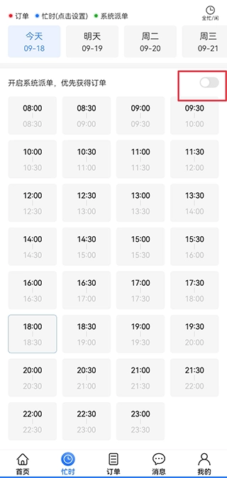 5、在忙时界面中,将系统派单开启,可以优先获得订单。