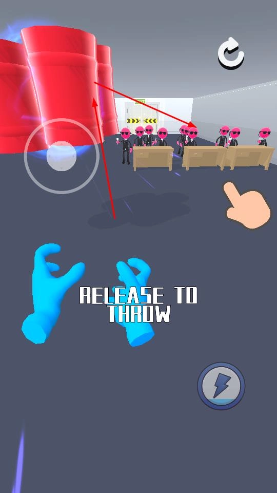 1. 通过滑动屏幕来操控蓝掌释放气功,也可以抓取物品进行投掷,同时要瞄准粉色敌人展开攻击。