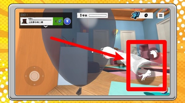 2.场景中猫咪利用跳跃与扑击技能进行互动,右下角按钮直观显示技能功能,带来更加灵活自由的操控体验。