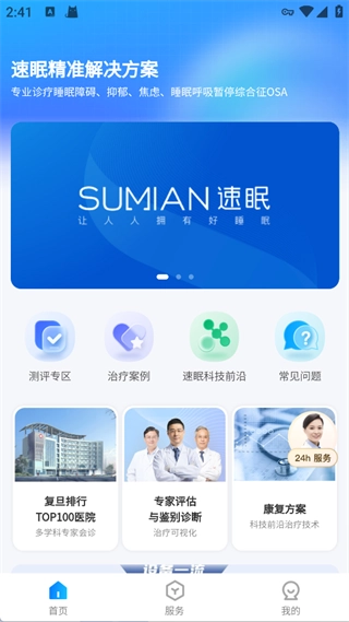 首页:提供精准的速眠解决方案,包含测评、案例、科技前沿、常见问题等板块,同时设有医院、专家、康复方案等睡眠健康服务的入口。