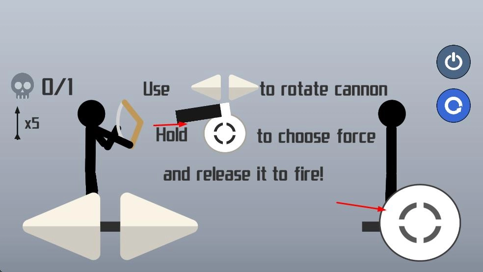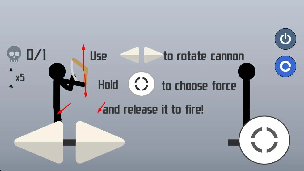 把准星对准敌方火柴人,松开按钮就能射出弩箭。看着左上角的骷髅头计数,好好规划每一次射击,把所有目标都消灭掉。