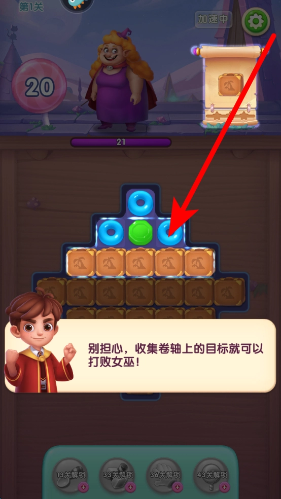 进入游戏后,映入眼帘的是带有不同元素的界面,需仔细观察元素的分布情况,按照提示消除对应的元素,以此推动收集卷轴目标的进度,为战胜女巫做好准备。