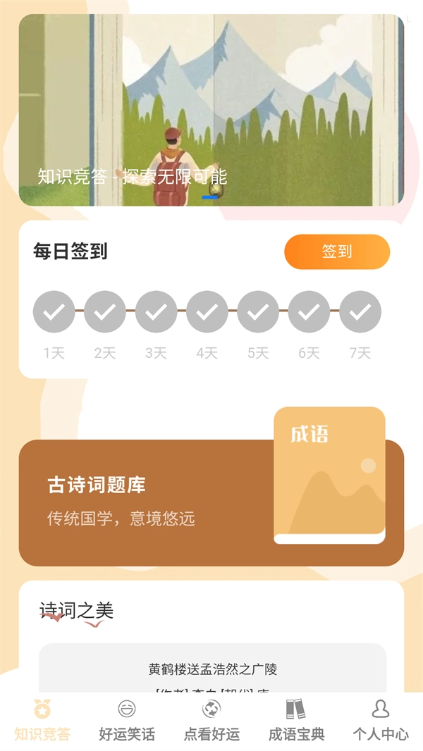 知识竞答:作为应用的核心板块,它覆盖了丰富多样的诗词知识领域。用户能够借助每日打卡的形式,在诗词的长河中遨游,感受古韵的独特魅力。这种不间断的学习过程,既充实了用户的文学储备,又提升了他们对诗词的喜爱程度与鉴赏水平。