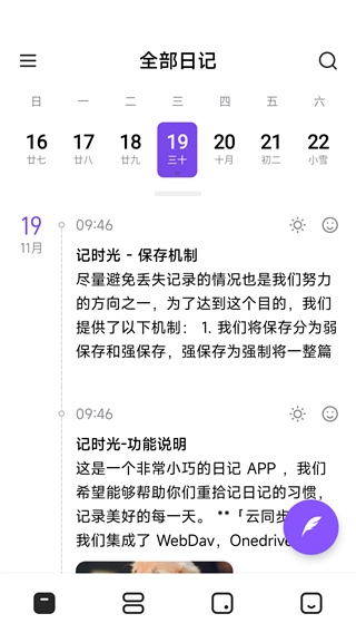 进入首页后,能看到所有日记和日历,也可以点击右下角的羽毛按钮来快速记录内容。