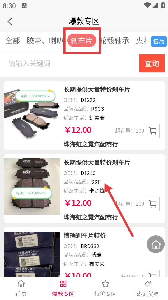 在爆款专区页面,点击【刹车片】分类标签,挑选目标商品,然后点击进入该商品的团购详情页。