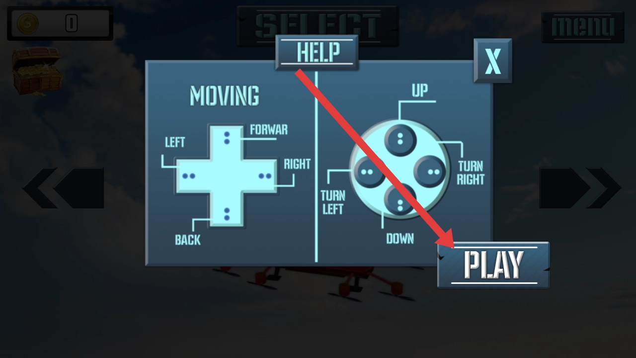 查看帮助界面的操作指引十字键移动、圆形键转向,点击PLAY按钮开启游戏,快速熟悉操控。