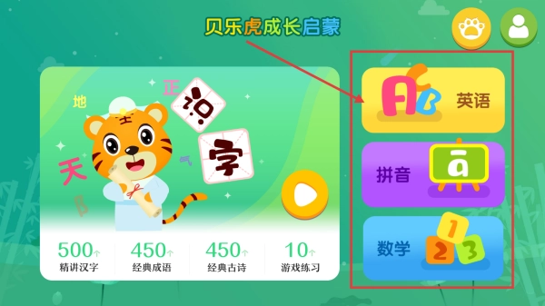 1. 打开贝乐虎成长启蒙应用,进入主界面后,点击右侧的英语分类入口,就能开启英语学习内容。