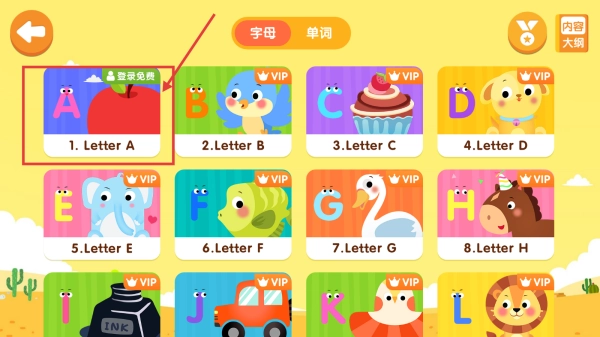 2、在英语字母学习页,选择带登录免费标识的Letter-A内容,进入字母A的学习环节。