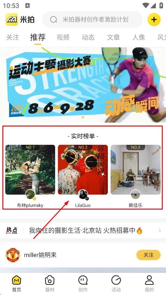 1. 来到首页的推荐栏目,重点关注【实时榜单】。在这里可以看到创作者们的作品,从中学习热门的摄影思路。同时,积极参与运动主题摄影大赛,上传自己的作品,向着榜单发起冲击。