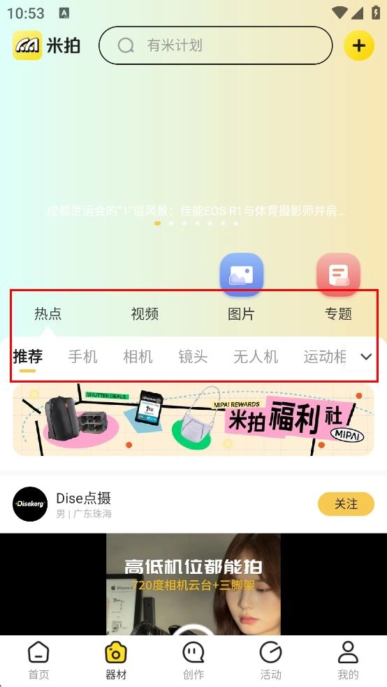 2. 通过【热点】【视频】等分类查找内容,选取手机、相机等标签筛选拍摄题材,同时了解摄影器材相关知识与福利活动,挖掘实用信息。