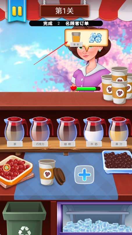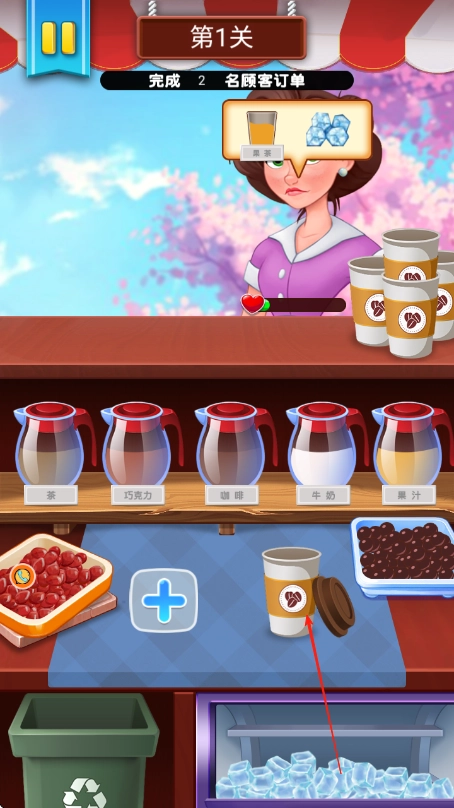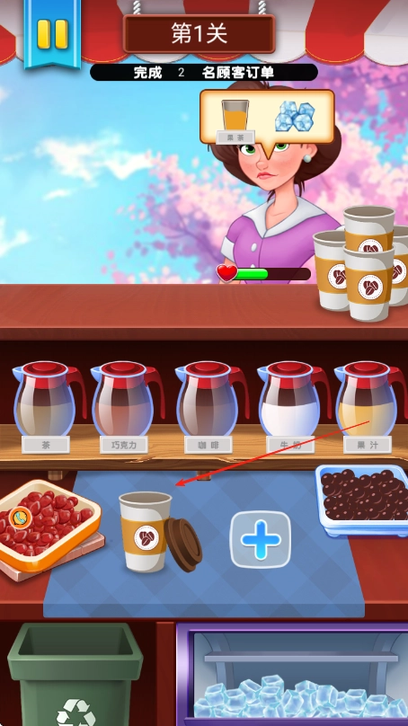 1. 踏入【第1关】,留意顾客头顶订单提示中红箭头所指方向,以此知晓顾客想要的饮品以及配料,就像这一单要求饮品加冰。