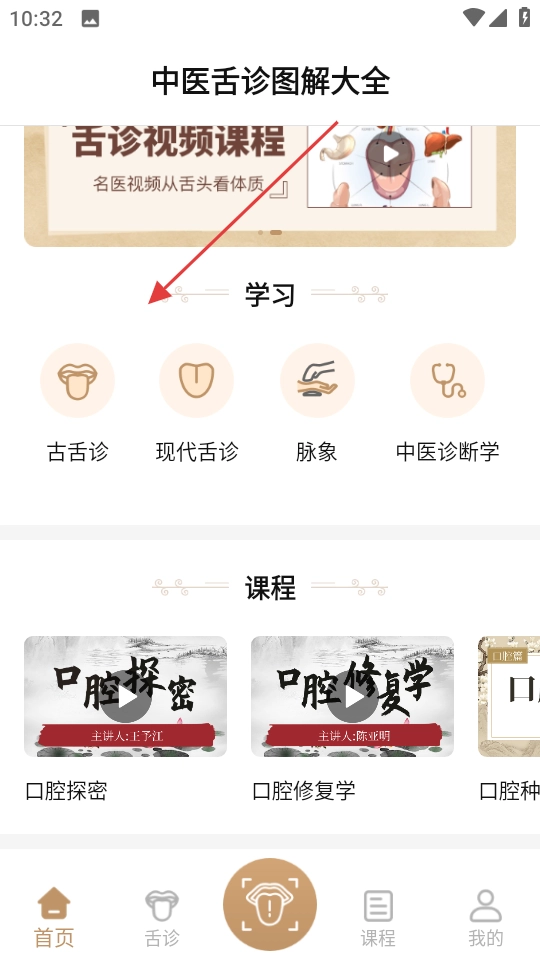 1、在这个主页上,将四大学习模块设计成圆形图标置于页面中间,点击“古舌诊”可直接跳转至相应内容。下方的课程展示栏会滚动呈现热门课程,学习者想要学习的内容一目了然,能迅速定位。
