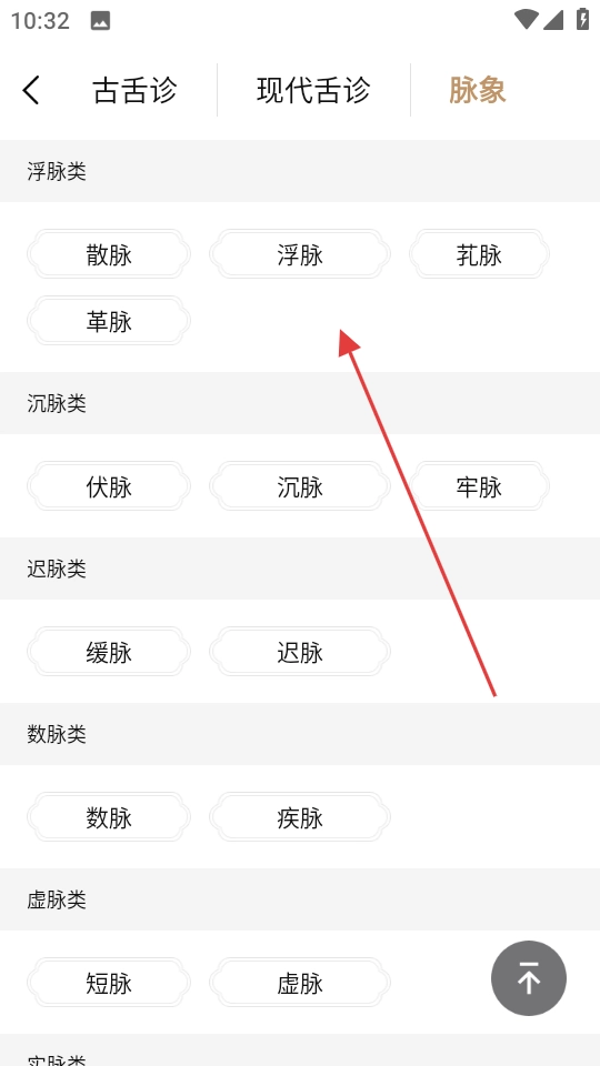3、切换到脉象标签就能查看各种脉象分类,像浮脉类,沉脉类都排得整整齐齐,每个脉象按钮点开应该会有详细说明,新手也能快速找到对应的诊断方法。