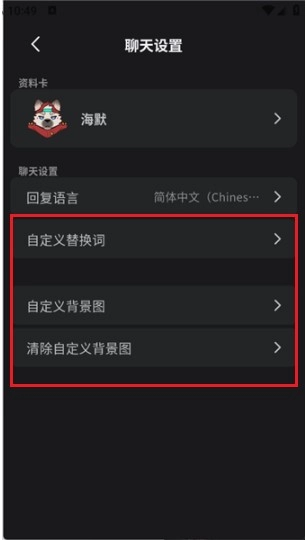 5、然后还可通过右上角菜单,设置语言、替换词及背景图,定制专属聊天体验。