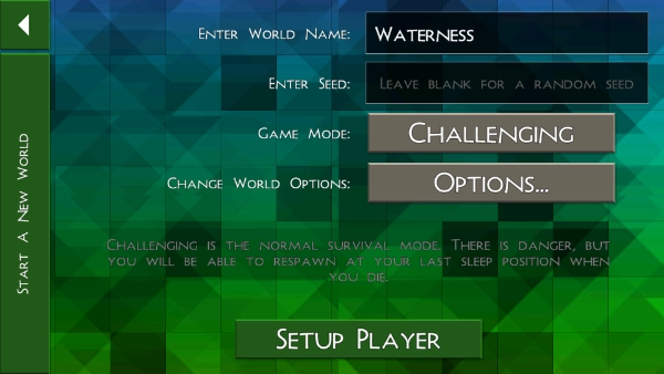 点击“new world”后,我们需要对创建世界进行自定义设置,设置完成后点击“setup player”