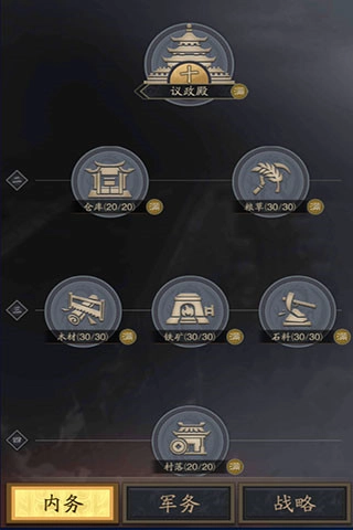 作用:增强城池的耐久度,提高统御值(该数值决定了武将搭配的上限),并解锁全部的内政与军务功能。