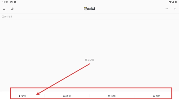 1. 打开MiGi应用的所有记事页面,轻点底部的T便签,随即进入便签创建模式,做好记录内容的准备。