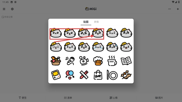 3、点击输入框后若弹出贴纸面板,选择喜欢的猫咪贴纸,添加到便签,装饰笔记,让内容更生动。