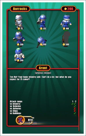 第四个任务关卡后就会出现蓝色的兵工厂和油井。油井会生产建造士兵所必需的石油。点击兵工厂就可以生产我们所需的士兵。