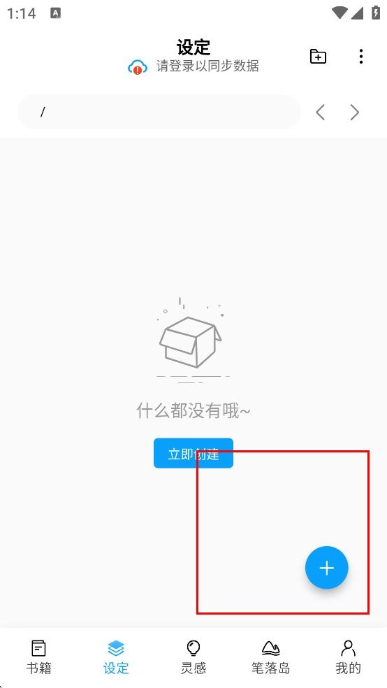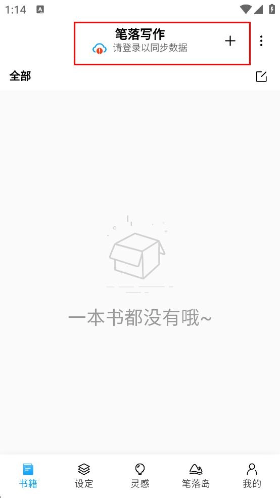 1、笔落写作的书籍界面,顶部展示名称,登录同步提示,点+可创建新写作项目,管理创作素材。