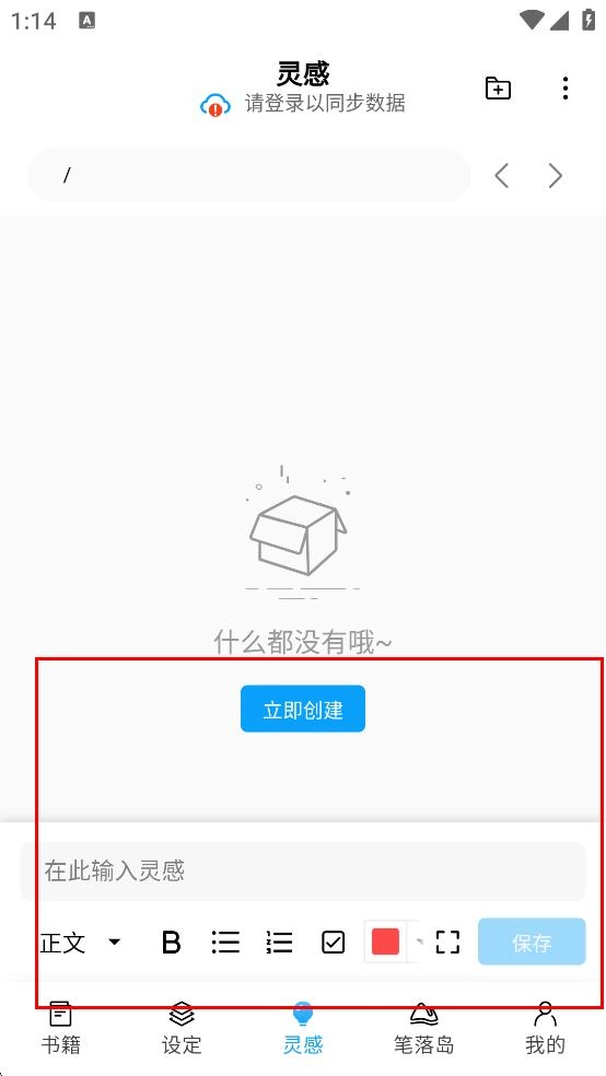 3、切换到灵感界面,立即创建来引导记录灵感,编辑工具,能随时录入,格式化保存创作的想法。
