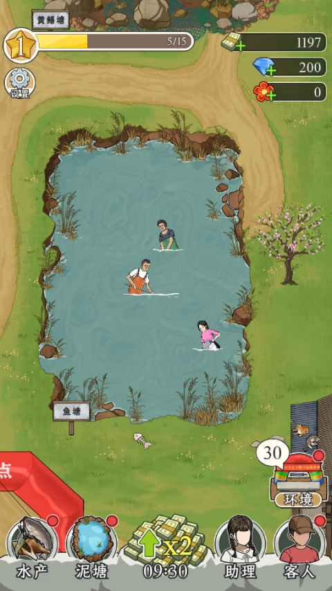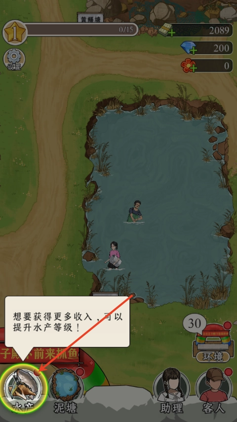 1、开局一个池塘,宣传吸引客人来抓鱼,用赚到的钱投资升级鱼塘,解锁更多新的水生品种,提升客人体验
