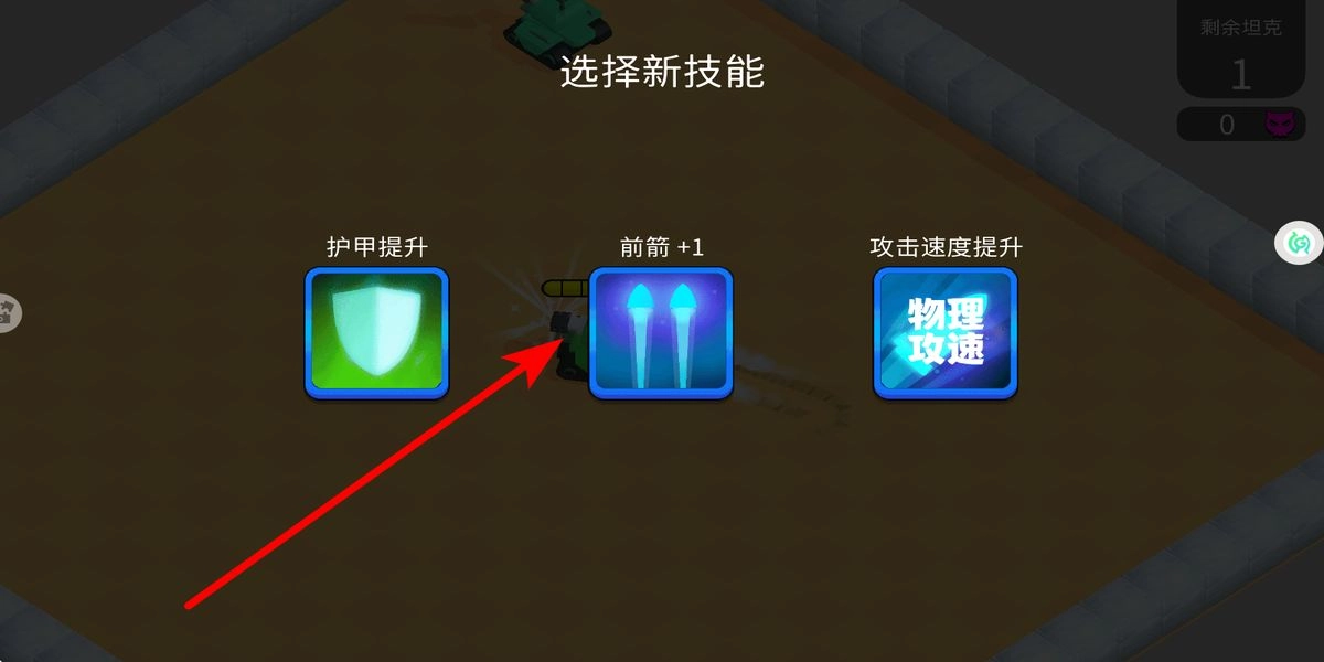 2、战斗中触发技能选择界面,依据战局需求挑选,若追求输出选前箭+1,若需生存选护甲提升,若要攻速选攻击速度提升,强化坦克作战能力。