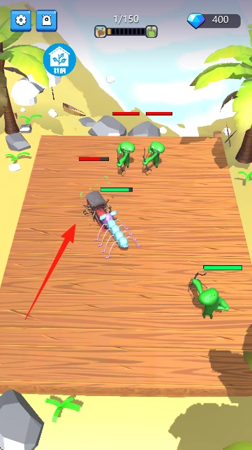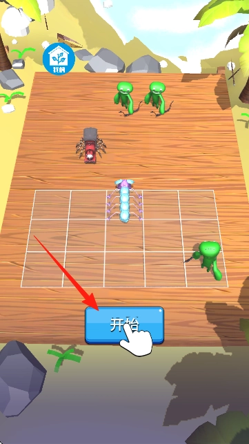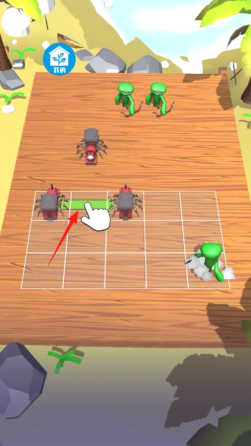 1、进入游戏,在木板场地中,点击方格放置防御机械红箭头所指处,抵御绿色怪兽进攻。