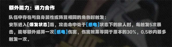 除此之外,在【爆发状态】下,安东还新增了感电结算机制,这一机制让安东异常精通属性的收益得到提升,同时减轻了安东在驱动词条方面的压力,因此在游戏前中期,安东已经能称得上是相当不错的主C了。