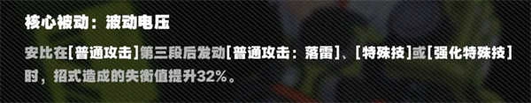 安比的核心被动也明显得到了增强,1级核心级的落雷、E技能以及强化E技能所带来的失衡值提升效果,从原来的6.3%上调到了32%。这使得她在实战中的失衡效率极为出色,是游戏前中期相当优秀的击破手,单就击破效率而言,足以与5星角色相媲美。