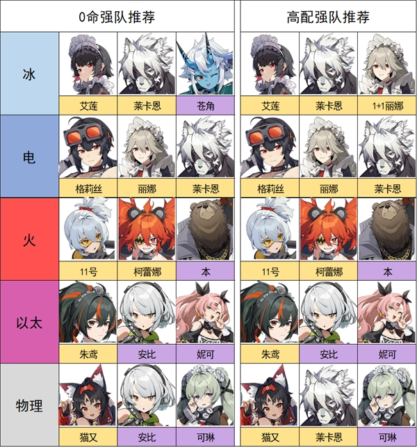 最后为大家提供各属性队伍的搭配方案,具体如图所示,希望这些内容能对大家有所帮助。