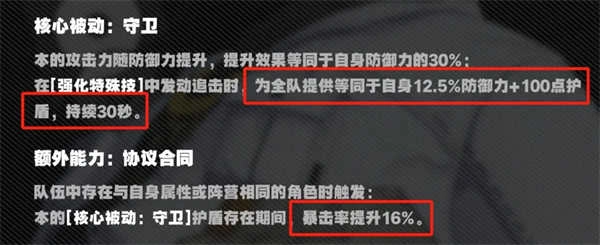 本的特性简单直接:能施加护盾并提供16%暴击率,效果持续30秒,几乎能全程覆盖战斗。要是后续推出更多增益型防护音擎,他的作用和地位应该会得到进一步提升。